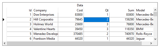 The color of the highlight is your system's highlight color. The floating editor style simulates the look and feel of the Microsoft Access datasheet. The blinking text cursor indicates that the cell is edit-ready, hence the name floating editor for this marquee style. Since no other marquee style places the cell in a similar edit-ready mode, the behavior of the grid with the floating editor is sometimes different from the other marquee styles. The following list summarizes the differences when the MarqueeStyle property is set to MarqueeEnum.FloatingEditor: