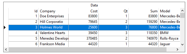 The entire row will be highlighted, but it will not be possible to tell which cell is the current cell in the row. To change highlight colors, edit the built-in HighlightRow style. See Highlighting the Row of the Selected Cell for more information. This style is most useful when the grid is not editable and users would view the data one record at a time.