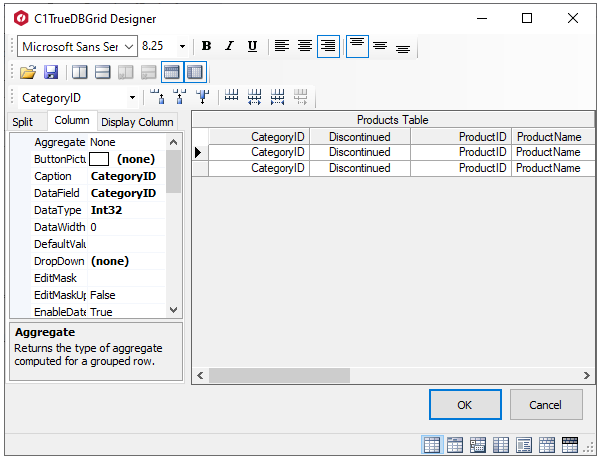 This designer allows grid columns to be set up easily at design time instead of having to write the code. Just select the grid, then right-click to bring up the context menu, and then click the Design menu item. This will bring up the C1TrueDBGrid Designer shown below: