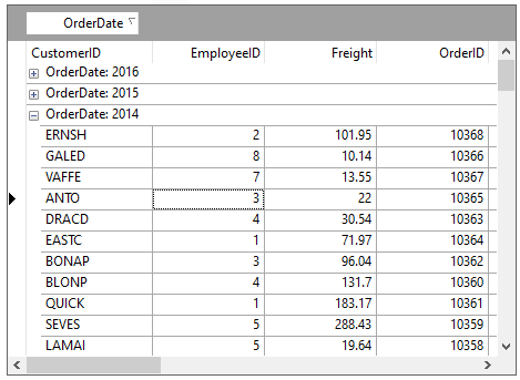 True DBGrid provides the GroupIntervalEnum enumeration that allows you to group data rows according to date, month, year, alphabet, date values (Outlook-style grouping), or you can customize how you would like to sort your data. The following topics explain how to group using a few of these settings.