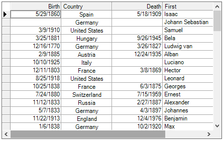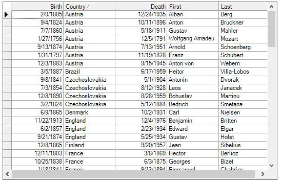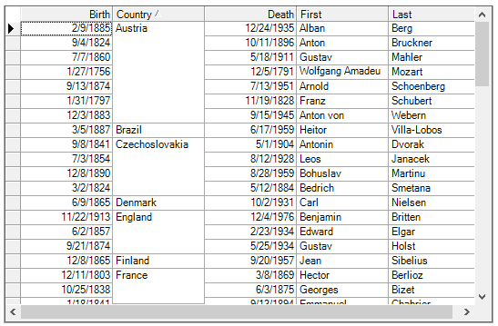 Executing this statement produces the following display. Note that when the current cell is in the Country column, the marquee spans all like-valued rows and takes on the appearance of a dotted rectangle, regardless of the setting of the MarqueeStyle property. The behavior of the marquee in other columns is not affected, however.