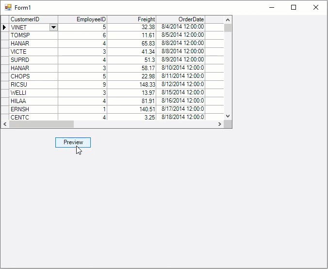 Run the application and notice the application appears with a button and grid displaying data. Click the Preview button and observe that a customized print preview form appears. The form only includes the Close button and not the Minimize and Maximize buttons.