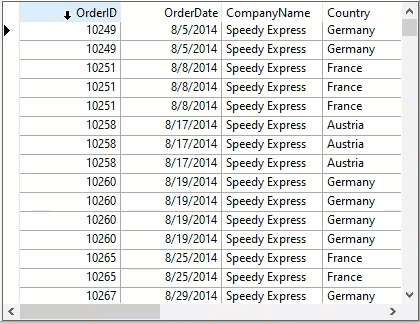 Row selection is also very easy to master with True DBGrid. When the cursor hovers over the record selector to the left of a row, a small arrow will indicate that this row is about to be selected. Then by clicking on this record selector, the row then becomes selected. To select a contiguous range of rows, manipulate the arrow keys while holding down the shift button. This will select the cells in every field for the range of rows that the user has selected. To select a non-contiguous range of rows, click on the rows to be selected while holding down the CTRL button. This will select the cells in every field for the set of non-contiguous rows that the user has selected.