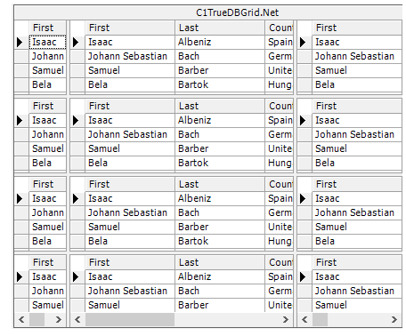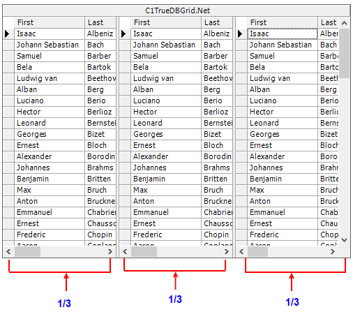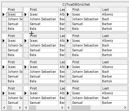 True DBGrid for WinForms provides full control over the size and scaling of individual splits. Configure a split to occupy an exact width or height, hold a fixed number of columns or rows, or adjust its size proportionally in relation to other splits. When initially starting out with True DBGrid for WinForms controls, splits can still be used in a variety of ways without having to master all of the details.