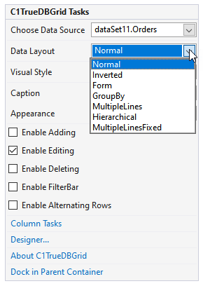 True DBGrid for WinForms allows you to view data in different ways through the DataView property, such as hierarchical, drop-down hierarchical, form, inverted, and multiple line. You can easily change the DataView property in the Properties window, in code, or by selecting a Data Layout option in the C1TrueDBGrid Tasks menu: