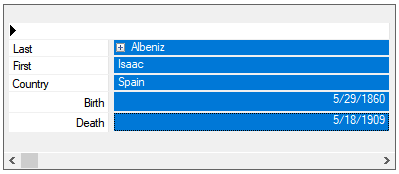 In situations where you would like to display data one record at a time, you can set the DataView property to DataViewEnum.Form. You can set this property either in the designer or in code to display data in an editable form similar to the one in the following illustration.