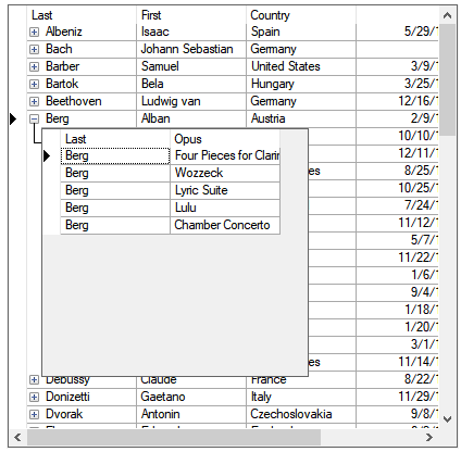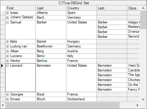 Notice that C1TrueDBGrid2 is rendered invisible and there is an expand icon ("+") beside the left most cell in each row. The master table contains a list of composers including vital statistics. Note, that as you scroll right, the expand icon remains in the left most cell at all times.