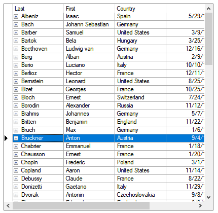 At run time, the grid displays read-only data. The next figure illustrates the initial display of the grid. The data from the master recordset (Composer) is displayed first, and the fields from the detail recordset bands appear to the right. The detail recordset fields initially contain no data, however. An expand icon ("+") at the left edge of a record indicates the presence of hierarchical data.