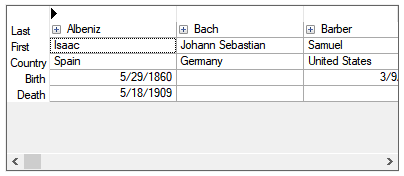 The inverted option of the DataView property inverts each row in your data into columns. In effect, the leftmost column becomes the top row, the second column becomes the second row, and so forth. Use this display to maximize screen real estate for tables that have many columns. Set the DataView property to DataViewEnum.Inverted to display an inverted grid as depicted in the following illustration.
