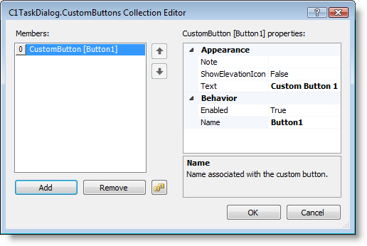 In the C1TaskbarButton.Buttons Collection Editor dialog box you can add thumbnail buttons to the taskbar and customize the appearance and behavior of each button. To access the Buttons Collection Editor, select the Edit Thumbnail Buttons link from the C1TaskbarButton control's Tasks menu, context menu, or below the Properties window, or click the ellipses button next to the Buttons property in the Properties window.