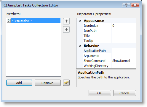In the C1JumpList.Tasks Collection Editor dialog box you can add and customize the appearance and behavior of task (shortcut) items that appear in the jump list. To access the Tasks Collection Editor, select the Edit Jump Tasks link from the C1TaskbarButton control's Tasks menu, context menu, or below the Properties window, or click the ellipses button next to the Tasks property in the Properties window.