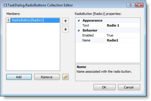 In the C1TaskDialog.RadioButtons Collection Editor dialog box you can add radio buttons to the C1TaskDialog dialog box and customize the text displayed next to each button. To access the RadioButtons Collection Editor, select the Edit Radio Buttons link from the C1TaskDialog control's Tasks menu, context menu, or below the Properties window, or click the ellipses button next to the RadioButtons property in the Properties window.