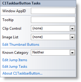 In the C1TaskbarButton Tasks menu, you can quickly and easily edit the appearance and behavior of the C1TaskbarButton component..