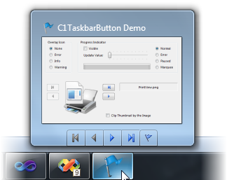 Taskbar button thumbnails, which are represented by the C1Thumbnail class, can consist of two elements: a live preview of the application and a toolbar.