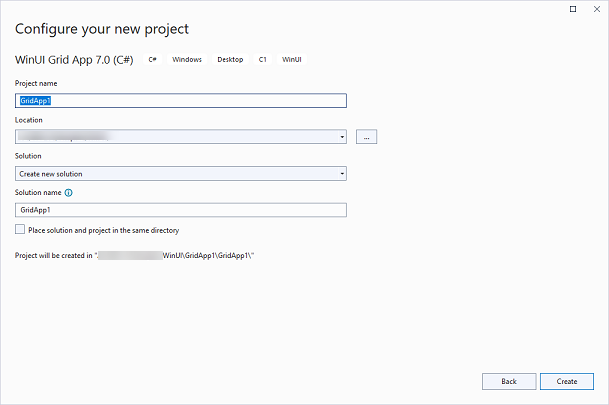 - In the Configure your new project window, provide name of the project you want to create in the Project name field, say Winui_App, and location for the project in the Location field. We have kept the default Project name, GridApp1. Then, click Create.