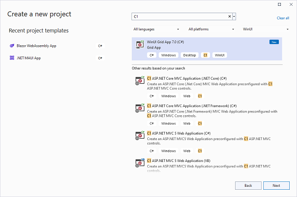 - In the Create a new project window, type C1 in the search bar to get the list of all the installed C1 templates and select WinUI from the project drop-down.
