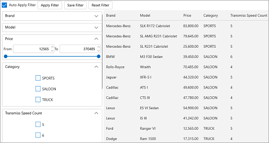 DataFilter reads properties of the data source and automatically creates corresponding filter type, such as BoolFilter, DateRangeFilter, CheckListFilter, and RangeFilter as showcased in the image below.