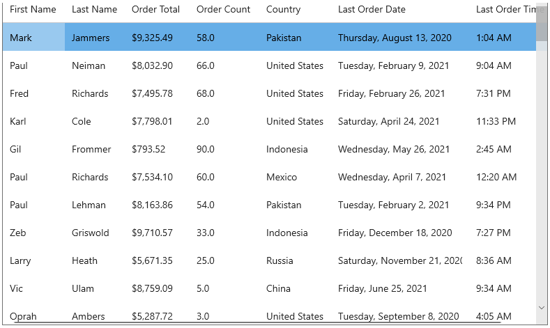 To control how content of the cells is formatted and displayed, set the Format property of Row or Column object to format string similar to the ones that are used with String.Format property in the .NET framework. For instance, the sample code below formats the second column as currency format, third column as number format, fifth column as short date format and sixth column as time format.
