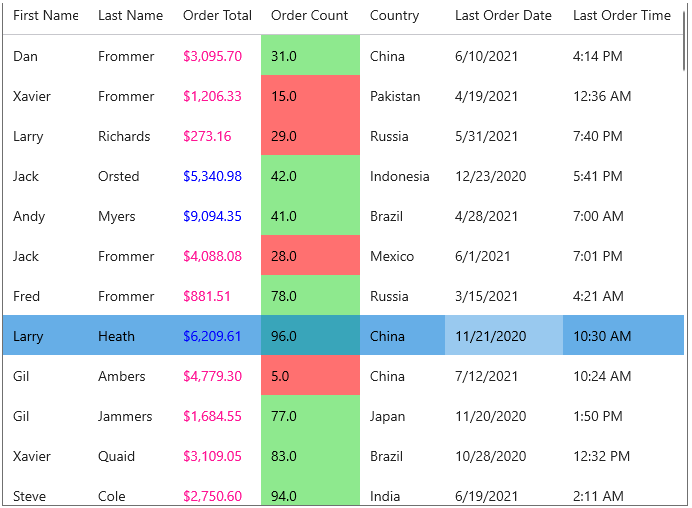 // For OrderTotal< $5000.0, set ForeColor of cell to DeepPink, else Blue