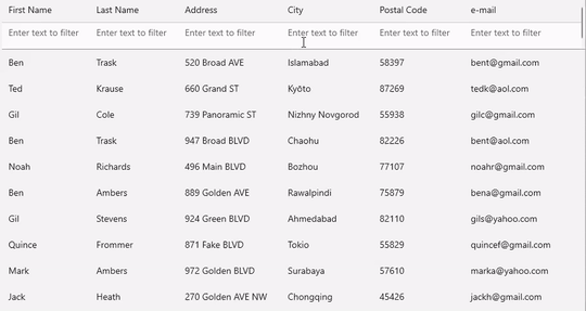 To enable filter row in FlexGrid, use the following code. This example uses the Customer.cs class used in Quick Start topic. The GridFilterRow class also provides the AutoComplete property, which when set to true, sets the typed text to auto-complete based on the data in the grid.