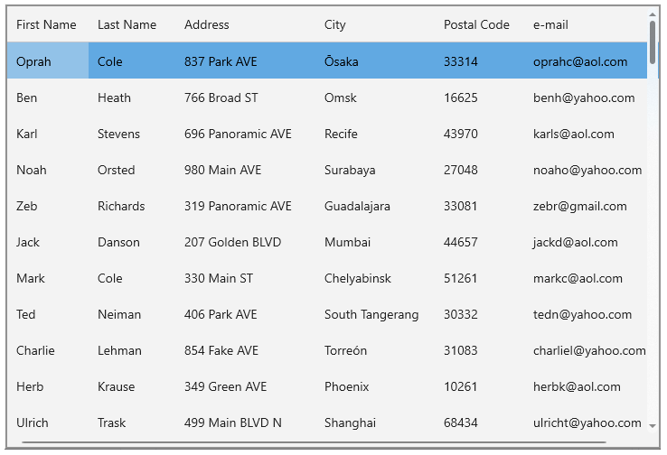 The following image displays the FlexGrid control showing the customer details, such as First Name, Last Name, Address, City etc.