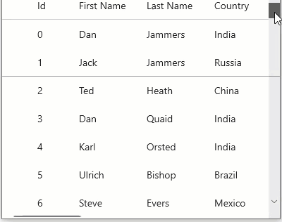Frozen rows, similar to fixed rows, are non-scrollable but can be edited by the user. In FlexGrid, frozen rows can be set by using FrozenRows property provided by the GridBase class.
