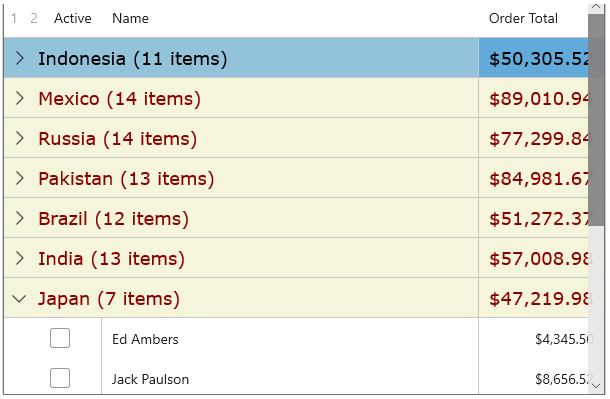 The following code illustrates customizing group row in FlexGrid using GroupRowBackground, GroupRowForeground, GroupRowFontFamily and GroupRowFontSize.