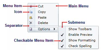 The main menu is a horizontal bar comprised of first-level C1MenuItems. Menu items can be standalone items, or they can contain lists of submenu items.