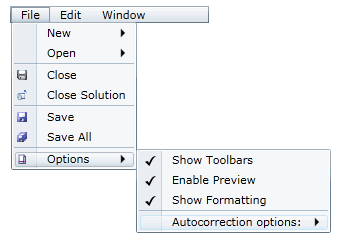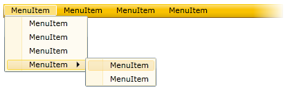 This topic only illustrates themes on the C1Menu control. However, the themes for the C1ContextMenu control are identical to the theming of the C1Menu control's submenus.