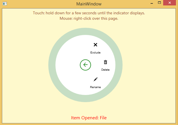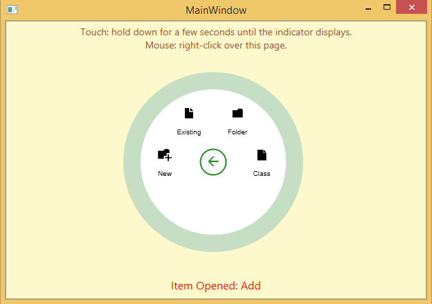 Right-click or tap on the Window and observe that the C1RadialMenu control appears. The radial menu displays four menus namely Add, File, Properties and Undo/Redo.