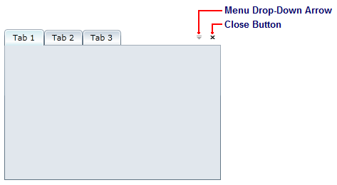 The tabstrip can also contain two optional items: a close button and a menu drop-down arrow. The close button, when clicked, closes the selected tab; the menu drop-down arrow, when clicked, exposes a drop-down menu from which users can open a different tab.