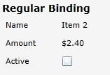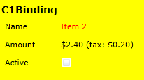 In this example, C1Binding expressions are used to make the binding a little more interesting. In this XAML, conditional formatting is used to display the FontWeight as Bold if the item is active or as Normal if not. The ForeGround is Blue if the item is active or Red if not.