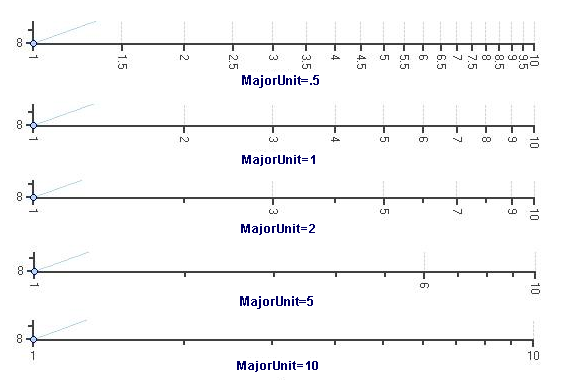 Often, when logarithmic scales are used, the bounds of a chart axis will span multiple cycles of the logarithmic base. In these cases, the usual linear specification of MajorUnit no longer makes sense, as a value appropriate for a given cycle makes little sense for the previous or next cycles. For the MajorUnit setting to be of value, it must pertain to values relative to each cycle of the logarithmic base.