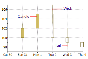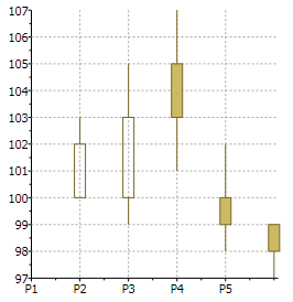 The following image represents the Candle chart when you set ChartType property to Candle and specify the data values for the XValues, HighValues, LowValues, OpenValues, and CloseValues, like the following: