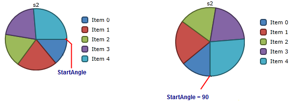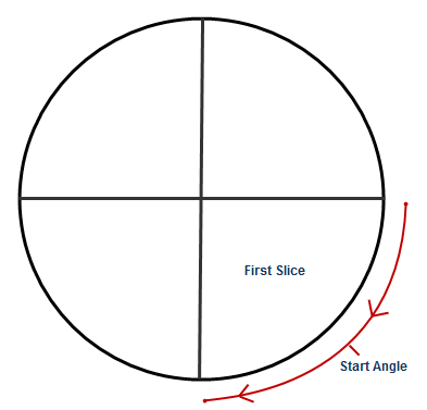 The PieOptions.SetStartingAngle property defines the position of the first slice within the Pie Chart. The first slice always begins at 90 degrees. The Start Angle runs clockwise from the 90 degree angle.