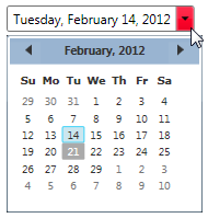 Press F5 to run the project. Notice the drop-down arrow is the color you specified in the C1DatePicker.ButtonBackground property. The C1DatePicker.SelectedDate should appear in the display box and it should show the full week day and month names.