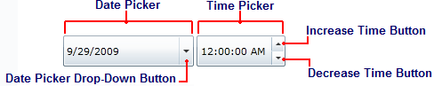 The time picker element is comprised of the time field, the increase time button, and the decrease time button. You can set the time by entering numeric values or by clicking the buttons.