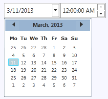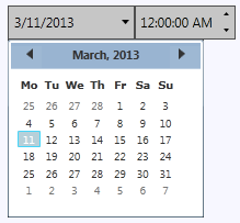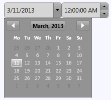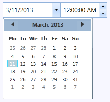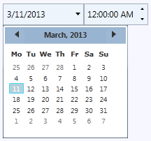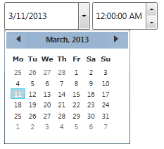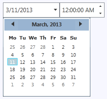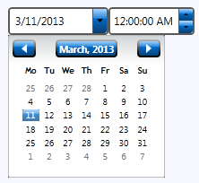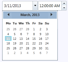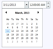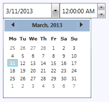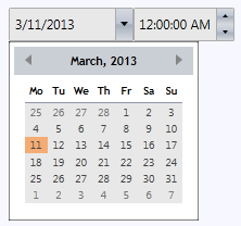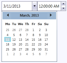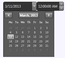 But the C1DateTimePicker control can also be themed with one of our thirteen included WPF themes: BureauBlack, C1Blue, ExpressionDark, ExpressionLight, Office2007Black, Office2007Blue, Office2007Silver, Office2010Black, Office2010Blue, Office2010Silver, ShinyBlue, and WhistlerBlue. The table below provides a sample of each theme:
