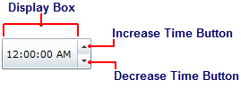 The display box presents the selected time. This can be set using the C1TimeEditor.Value property. Users can also input numeric date into the display box. When you enter a numeric value, it will automatically be converted into time. The control can display time in three edit modes: LongTime (default), ShortTime, and TimeSpan.