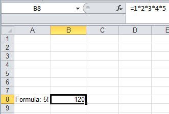 Notice that the value for the cell in (7,1) is 120, or the total of 1*2*3*4*5, not 122, since we set the CalculationMode to Auto.