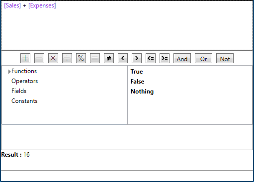 The following image exhibits the Expression Editor control which is bound to an instance of a class that represents sales and expenses for different countries.
