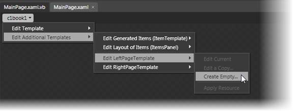 You can access page templates in Microsoft Expression Blend by selecting the C1Book control and, in the menu, selecting Edit Additional Templates. Choose Edit LeftPageTemplate or Edit RightPageTemplate and select Create Empty to create a new blank template.