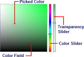 Transparency Slider: This slider lets you lets you set the color's transparency. You can choose to make the color opaque or partially or completely transparent. Move the Transparency Slider to pick a transparency. This slider is only visible when the C1SpectrumColorPicker.ShowAlphaChannel property is set to True (default)