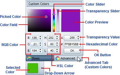 OK Button: Once you are satisfied with the color choice, click the OK button to close the drop-down box and set the color as the Selected Color.