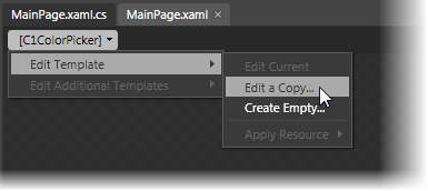 You can access templates in Microsoft Expression Blend by selecting the C1ColorPicker control and, in the menu, selecting Edit Control Parts (Templates). Select Edit a Copy to create an editable copy of the current template or Create Empty, to create a new blank template.