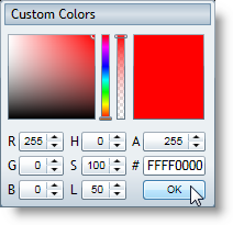 Click the drop-down arrow in the left color picker. Notice that the window opens above the drop-down box and that only the advanced mode is visible – this reflects the changes you made to the control. In advanced mode, users can specify any color and can use multiple methods of selecting a color.