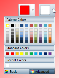 Notice that the Basic tab is visible (default). This tab displays Palette Colors, Standard Colors, and Recent Colors. You can pick any color and can also switch to the Advanced tab to pick a custom color. Note that the currently selected color is highlighted with a red border.