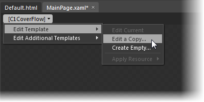 You can access templates in Microsoft Expression Blend by selecting the C1CoverFlow control and, in the menu, selecting Edit Template. Select Edit a Copy to create an editable copy of the current template or select Create Empty to create a new blank template.