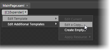 You can access templates in Microsoft Expression Blend by selecting the C1Expander control and, in the menu, selecting Edit Template. Select Edit a Copy to create an editable copy of the current template or select Create Empty to create a new blank template.