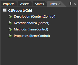 In Microsoft Expression Blend, you can view and edit template parts by creating a new template (for example, click the C1PropertyGrid control to select it and choose Object | Edit Template | Edit a Copy). Once you've created a new template, the parts of the template will appear in the Parts window: